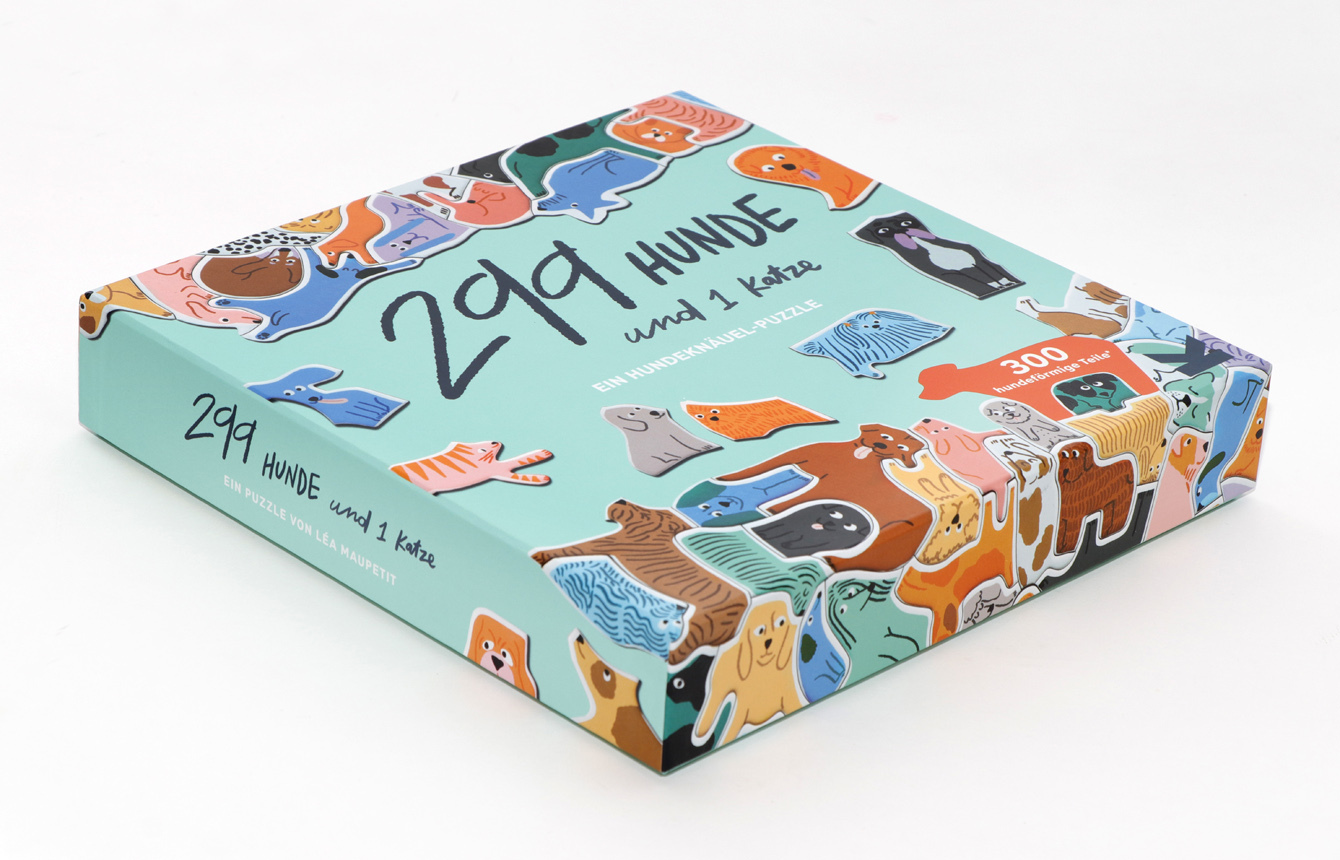 In diesem raffinierten, kreisrunden Knäuel-Puzzle gibt es keine normalen Teile: Alle sehen aus wie Hunde! Und es gibt 299 von ihnen! Plus eine Katze. Damit sie alle zusammenbleiben, gibt es einen praktischen Rahmen: Bauen Sie diesen zuerst, das wird Ihre Hunde halbwegs bändigen.