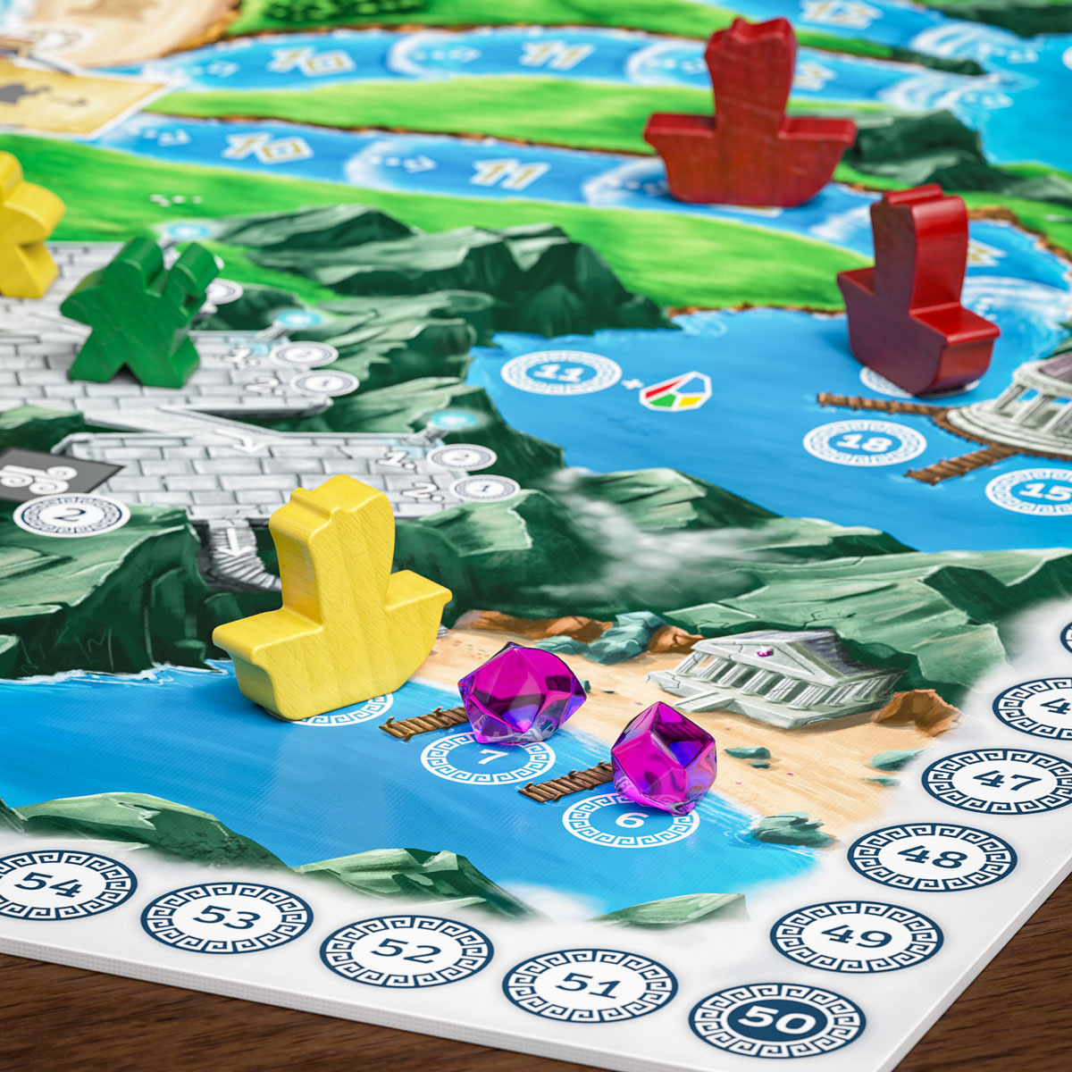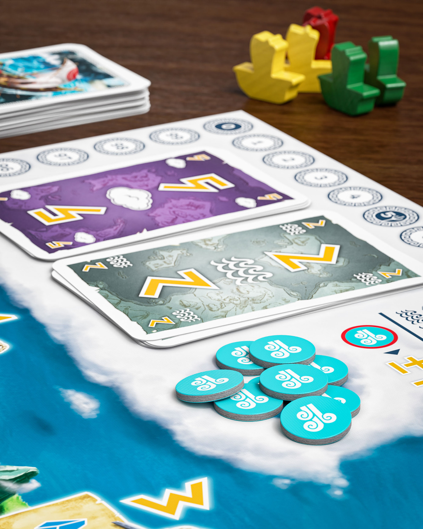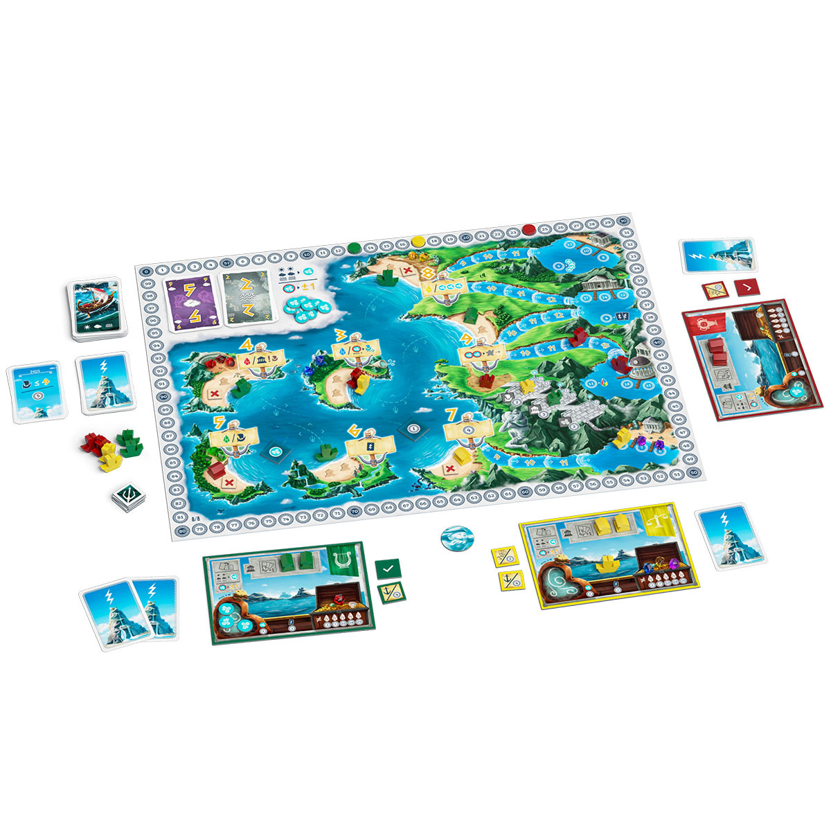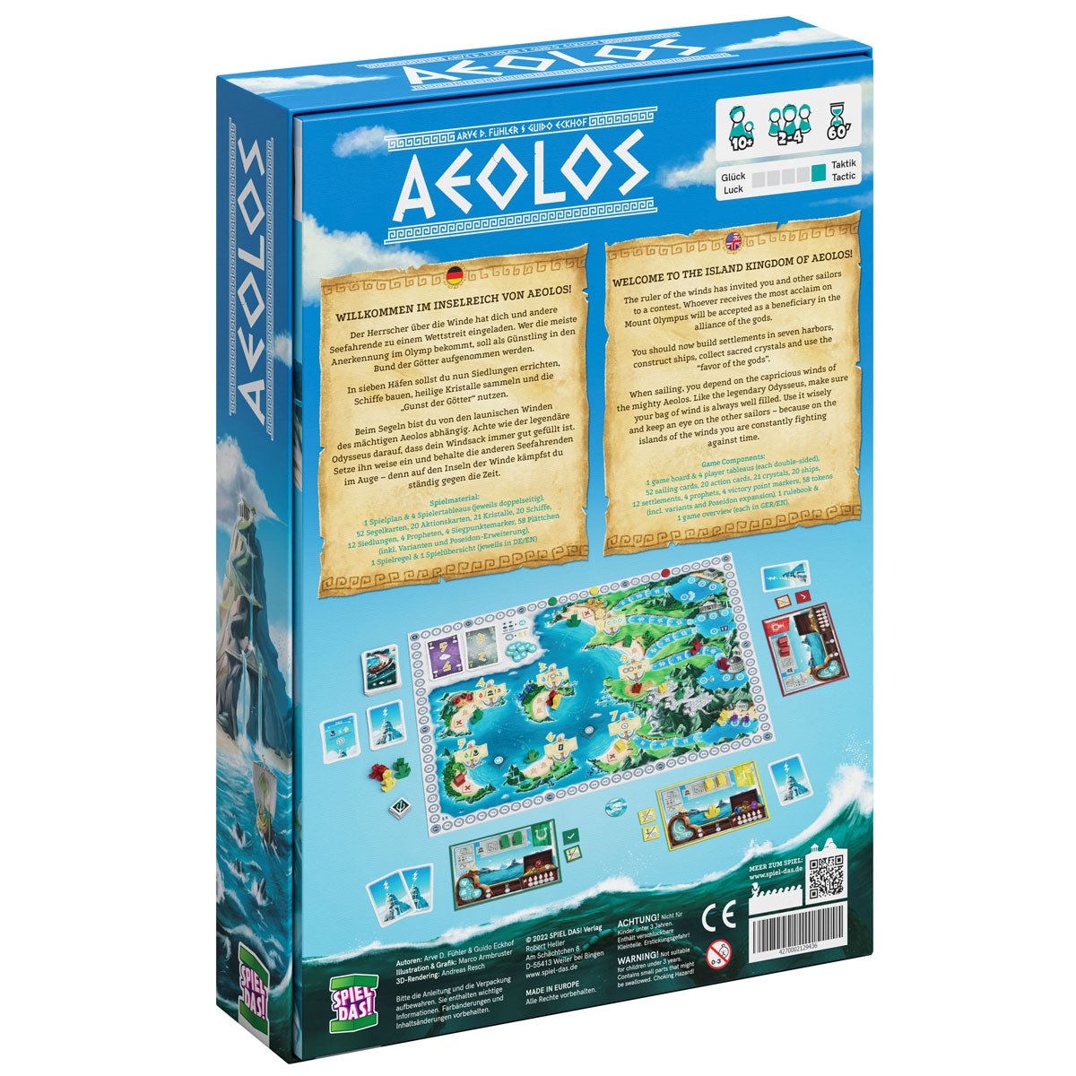 In AEOLOS, players take on the role of sailors who expand their fleets, build temples and collect god cards to gain glory. To do this, they skilfully deploy ships, use wind cards for movement and place houses on islands to secure advantages and victory points. The winner is the player who has collected the most victory points through temples, god cards and majorities.