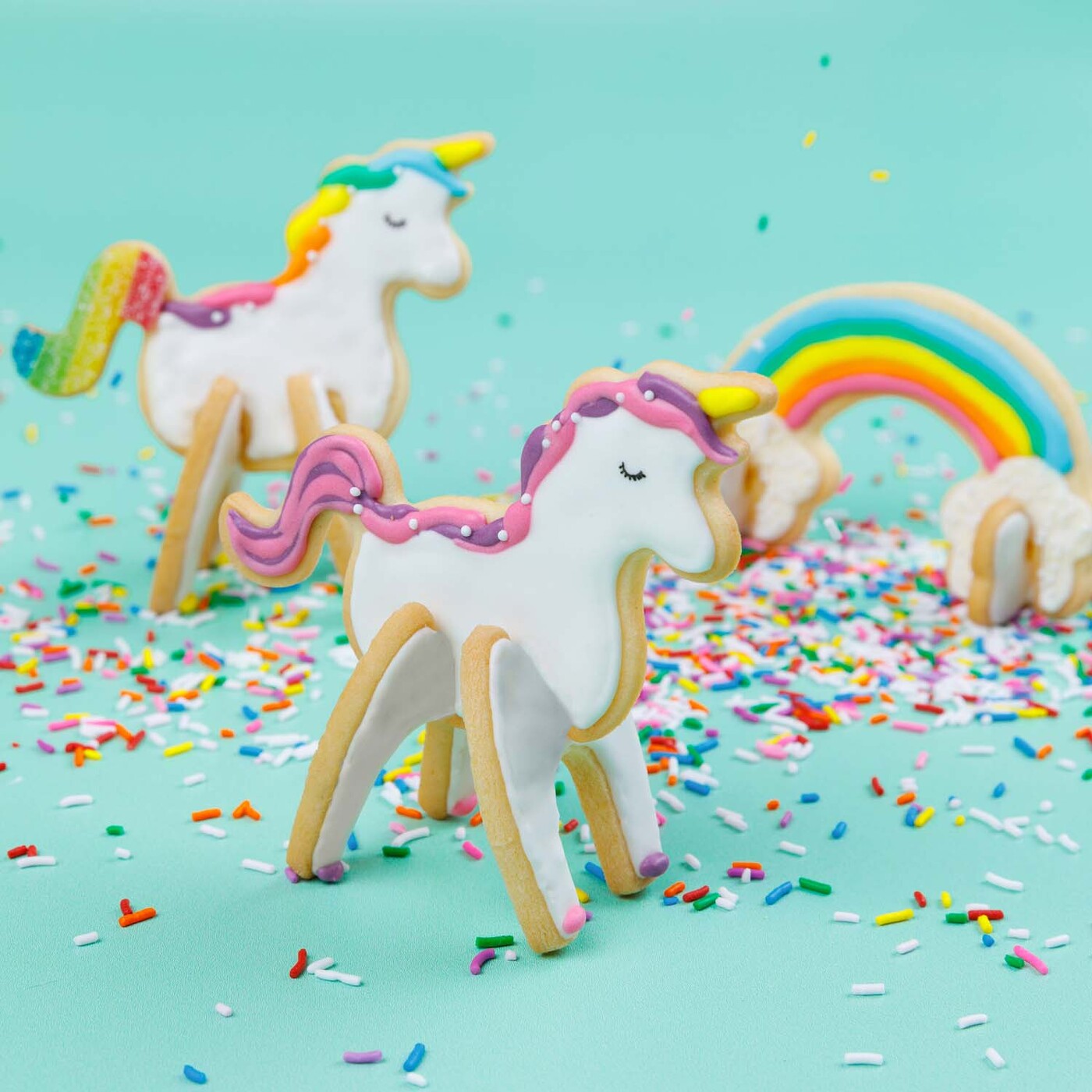 Gefrier- und spülmaschinenfeste Ausstechformen. Miteinander kombiniert können ein Regenbogen und Einhorn zusammengesteckt werden Inkl. Illustriertem Schritt-für-Schritt-Rezept mit Video. Das zusammengesteckt Einhorn ist 9,5 cm groß, der Regenbogen 7 cm.