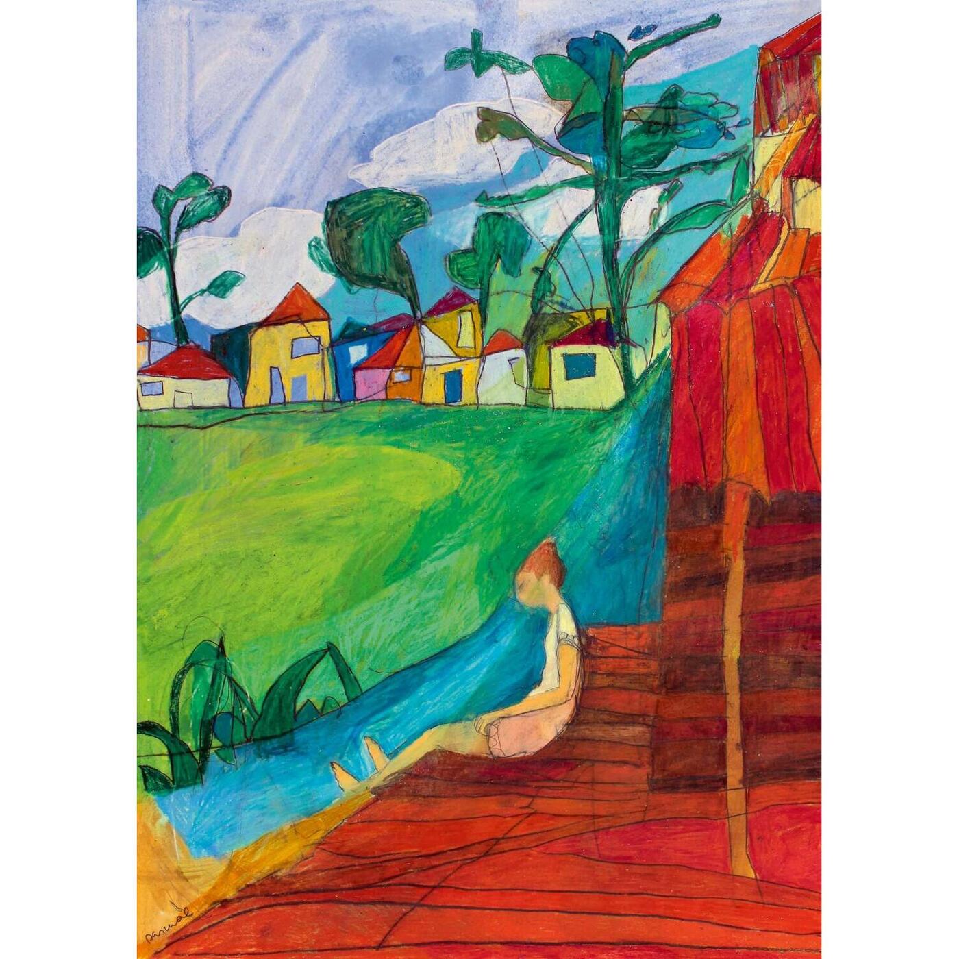 Entspannt an einem Fluss sitzen auf einer Holzterrasse mit Blick ins Grüne bei einem fröhlichen, kleinen Ort – da möchte man sein! An die Teile und reingepuzzelt! 1.000 Teile; Maße Puzzle: 500 x 700mm
