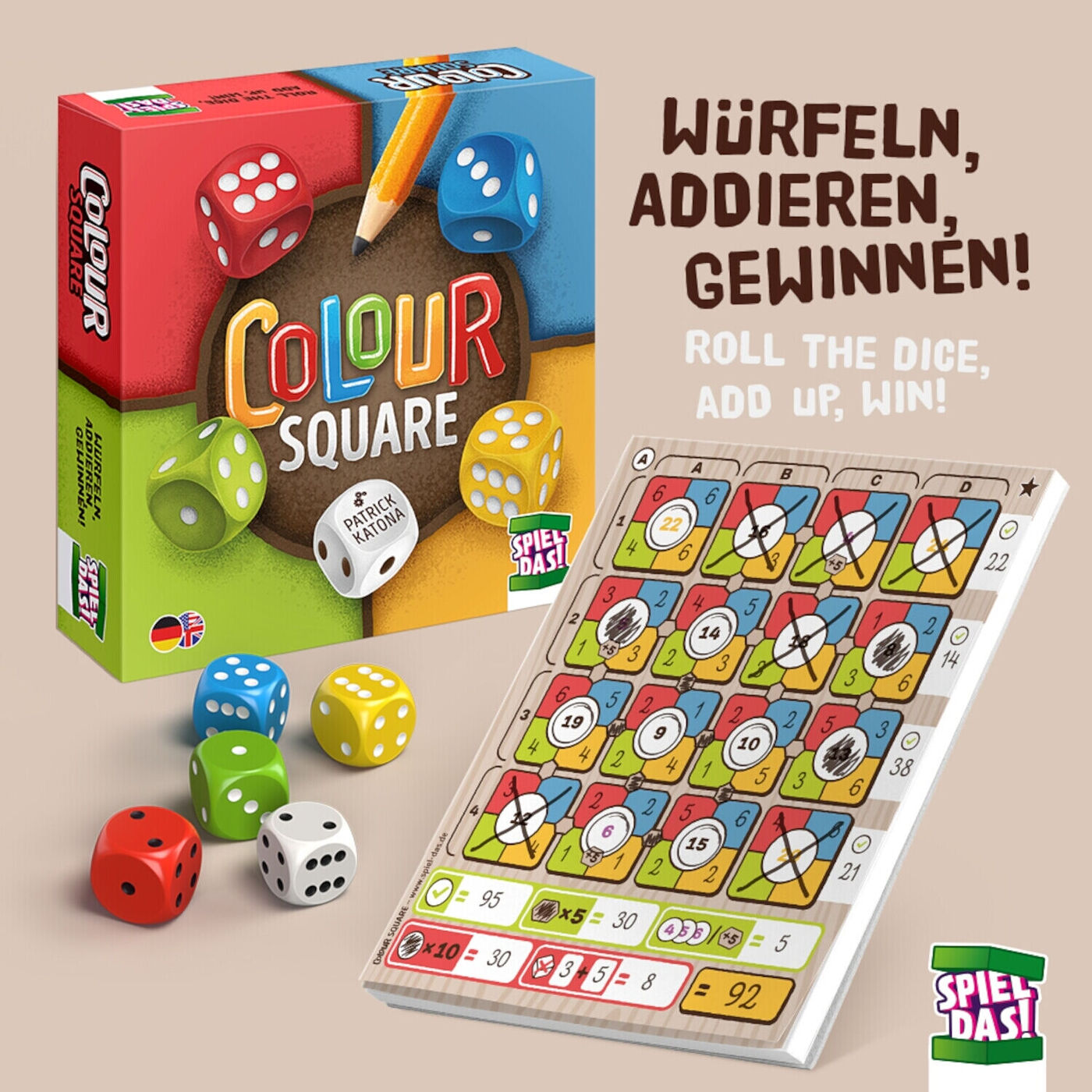 In COLOUR SQUARE, players try to achieve the exact sum in the middle by skilfully entering dice results in the coloured corners of a square. To do this, dice values are entered in free corners, SQUARES are closed and additional points or minus points are scored with bridges or jokers. At the end, the player who achieves the highest total score by correctly closing SQUARES, earning bonus points and incurring as few penalty points as possible wins.
