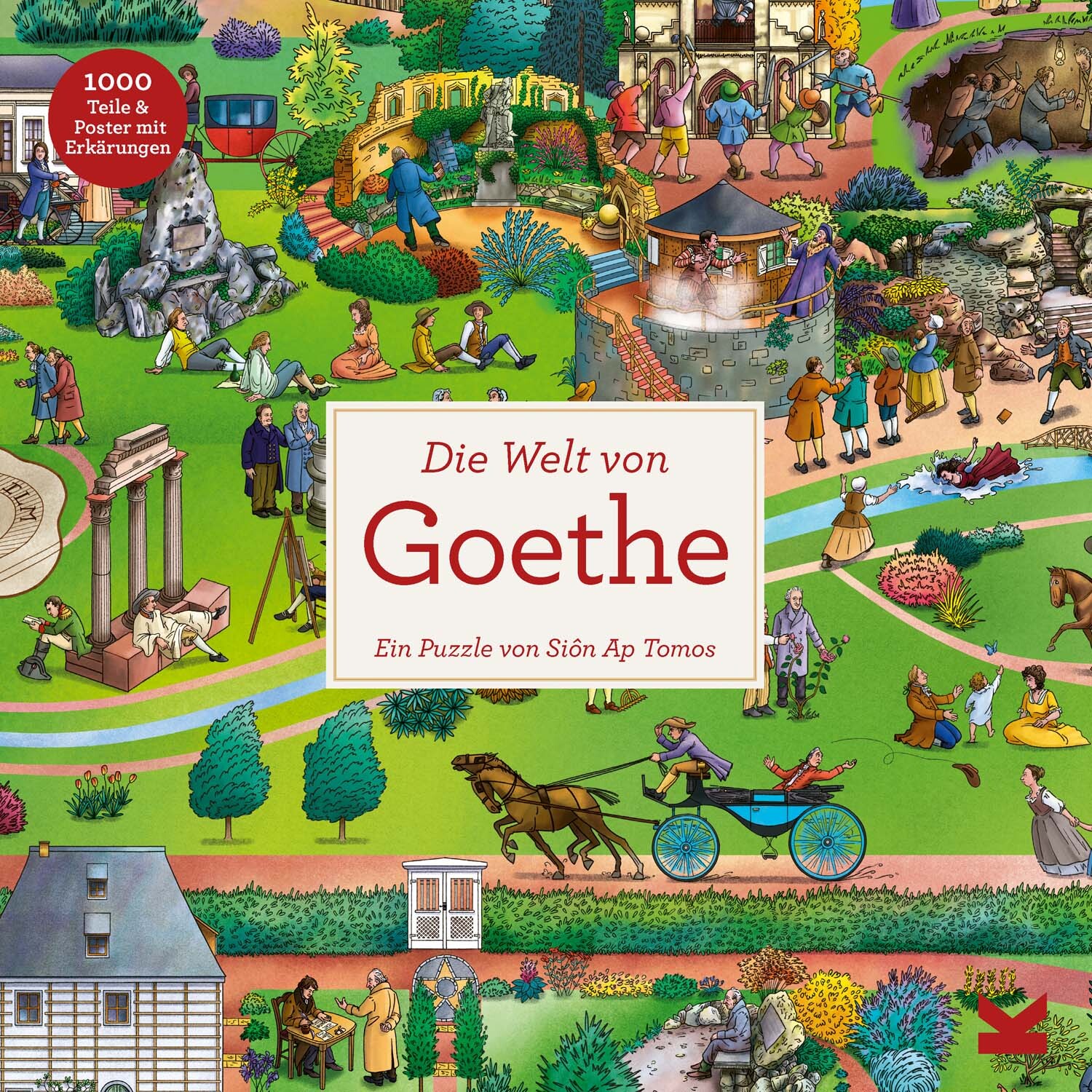 Die meisten kennen Goethe als Schreibenden, als den Schöpfer von Werther, Faust und Götz von Berlichingen – doch Goethes Welt war größer! Er interessierte sich für Bergbau und Mineralogie, für Botanik und Farbenlehre, er war ein echter Naturforscher. Reisen Sie mit diesem Puzzle nach Weimar in den Ilmpark, den Goethe selbst mitentwarf, und entdecken Sie sein berühmtes Gartenhaus, besuchen Sie eine Theateraufführung im Tempelherrenhaus, leiden Sie mit Werther und treffen Sie zahlreiche historische Persönlichkeiten aus Goethes Leben. Und wenn Sie Ihren Blick ein wenig in die Ferne schweifen lassen, werden Sie dort Rom und den Vesuv entdecken…
