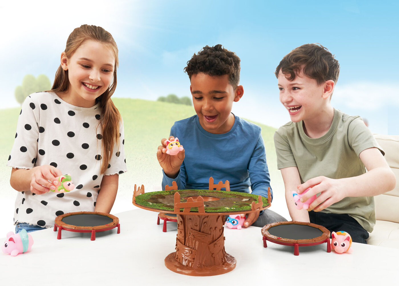 Jippieh! Spring vor Freude mit Flieg Schweinchen Flieg! Benutze die Trampoline, um mit deinen Schweinen in den Schweinestall zu hüpfen und versuche, in der Schlammpfütze zu landen! Für jedes Schwein, das du in der Pfütze landest, bekommst du einen Schlammkuchen. Hüpfe mit deinen Schweinen so lange, bis alle Schlammkuchen weg sind – das schlammigste Schweinchen gewinnt! Lass sie fliegen!