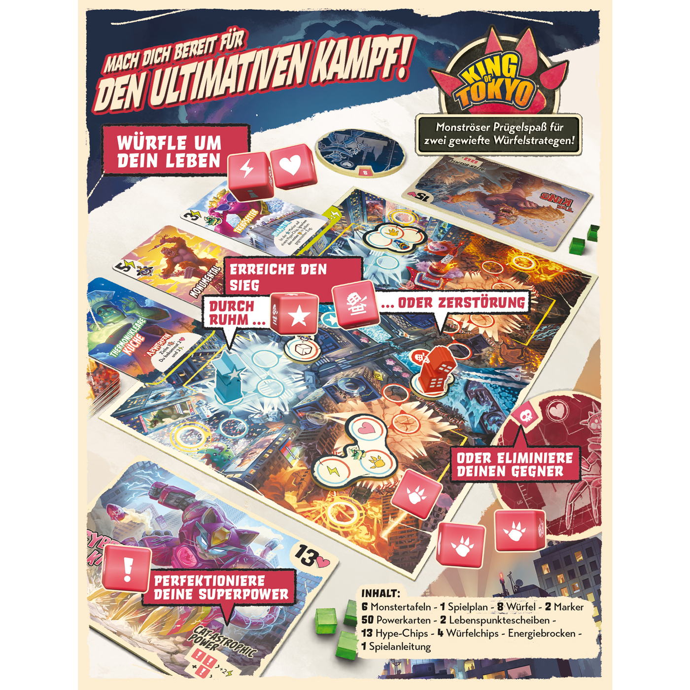 Als die Macht über Tokyo hereinbricht, erheben sich zwei Angst einflößende Gestalten wie Phönix aus der Asche der zerstörten Wolkenkratzer. Doch nur ein Monster kann zum King of Tokyo gekrönt werden, indem es seinen Gegner ordentlich verprügelt oder der gebannten Menschenmenge Tokyos Schrecken und Bewunderung einflößt.