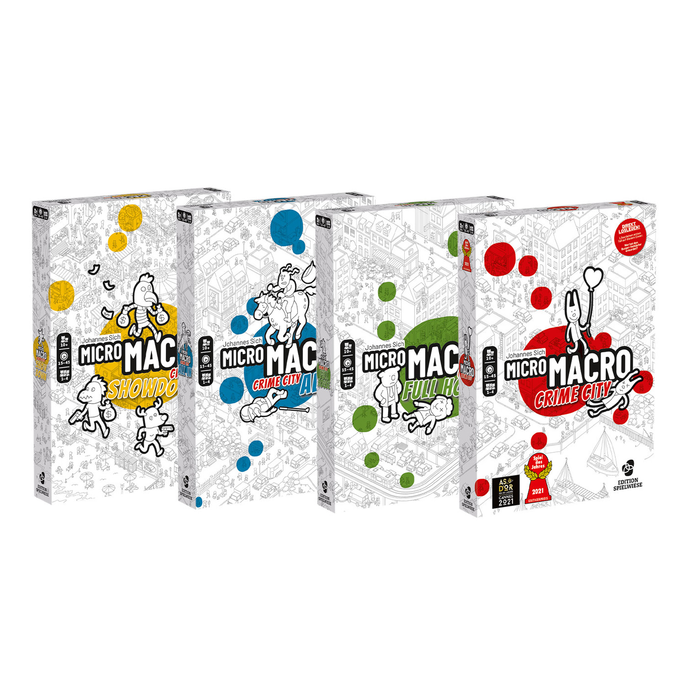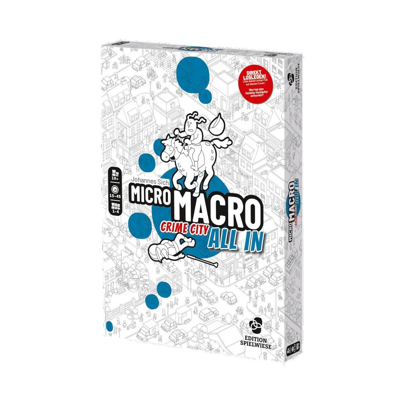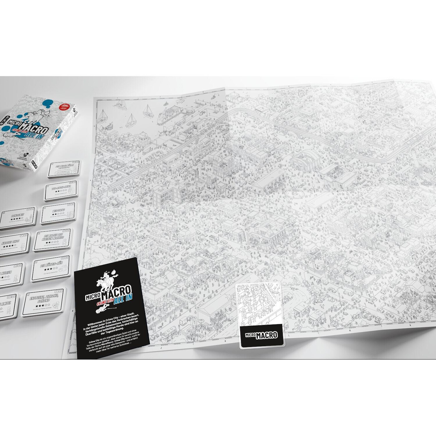 With MicroMacro: Crime City—All In, players explore a new district of the crime-ridden metropolis on a huge city map that seamlessly connects to the previous ones. Once again, 16 brand new and devious cases await one to four detectives, who must uncover motives, find evidence and convict the perpetrators. An attentive eye and deduction skills are essential to unravel everything on the 75 x 110 cm map, supported by a magnifying glass. Symbols mark the cases so parents can decide which are suitable for younger players. All In is a standalone game and does not require knowledge of the earlier titles.