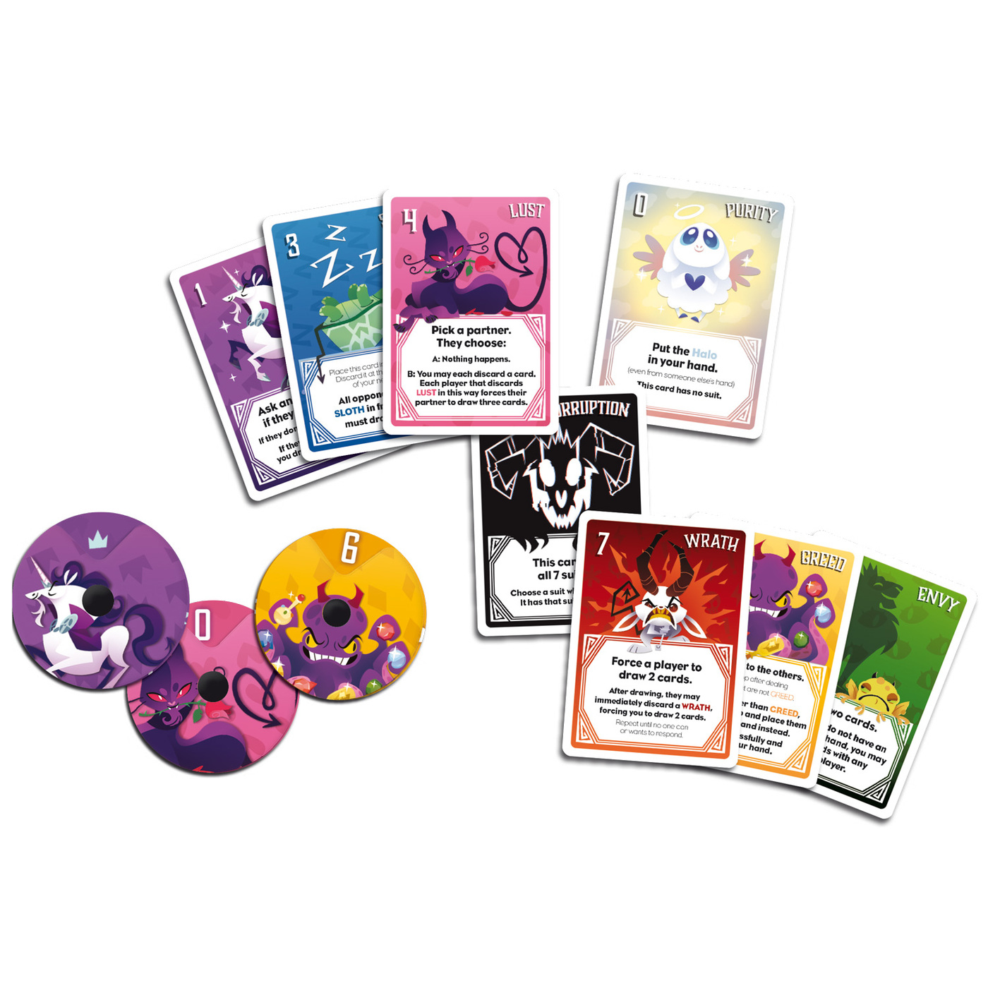 Entledige dich deiner Sünden, indem du Karten gleichen Typs oder Wertes ausspielst. Aber Vorsicht: Jede Sünde löst ihre eigenen Effekte aus.