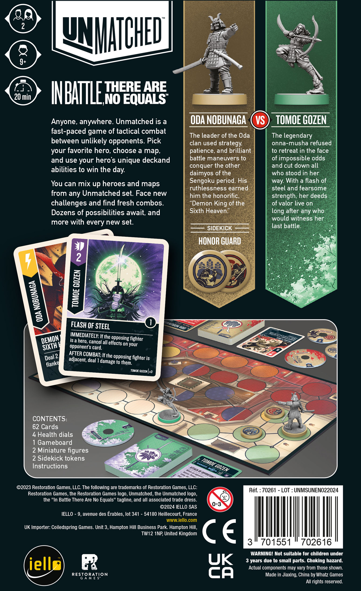 Unmatched is a highly asymmetrical miniature fighting game. A unique deck, designed to evoke his or her style and legend, represents each hero. You can mix up heroes and maps from any Unmatched set. Face new challenges and find fresh combos.