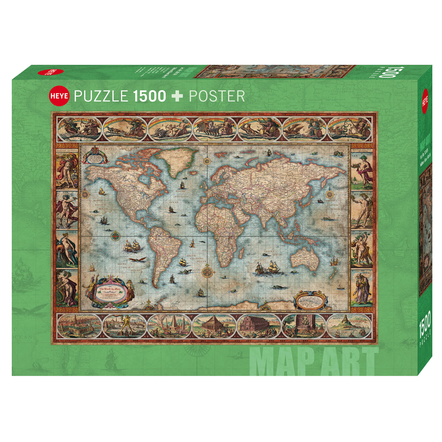 Diese auf Willem Blaeus kartografischen Meisterwerk von 1630 basierende Weltkarte bietet rings um die klassische Darstellung der Erde vielerlei szenische Illustrationen.