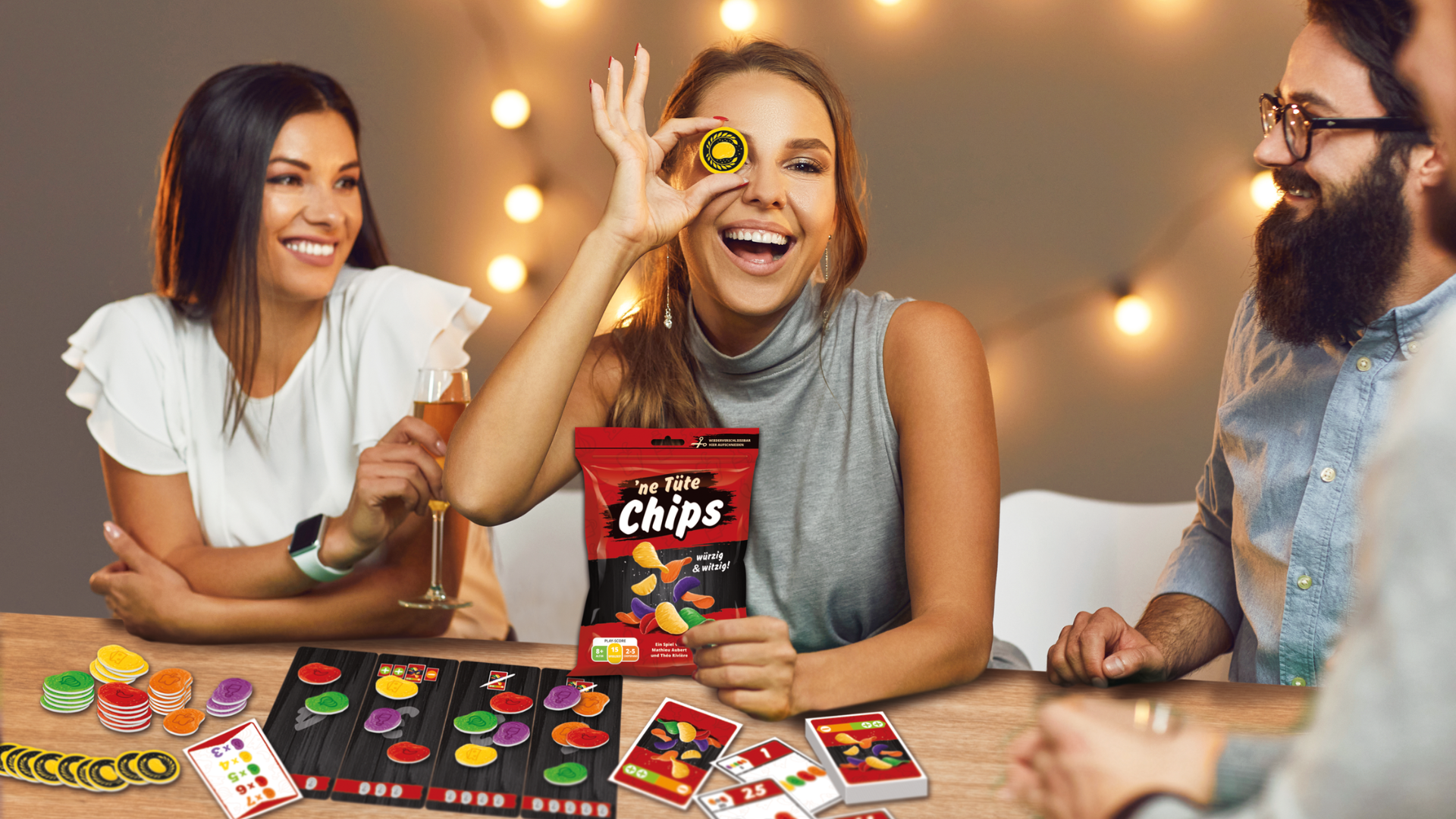 ´ne Tüte Chips ist ein einfaches und lockeres Familienspiel, bei dem ihr jede Runde in die Chips-Tüte greift und knifflige Entscheidungen treffen müsst, um so viele Punkte wie möglich zu bekommen. Zu Spielbeginn erhält jeder von euch Karten, die für bestimmte gezogene Chips-Kombinationen Punkte bringen. Runde für Runde müsst ihr euch entscheiden mit welcher Karte ihr bei Spielende punkten wollt. Welcher Chip wird wohl als nächstes gezogen? Seid vorsichtig, denn wenn ihr zu gierig seid, könnt ihr viel verlieren!