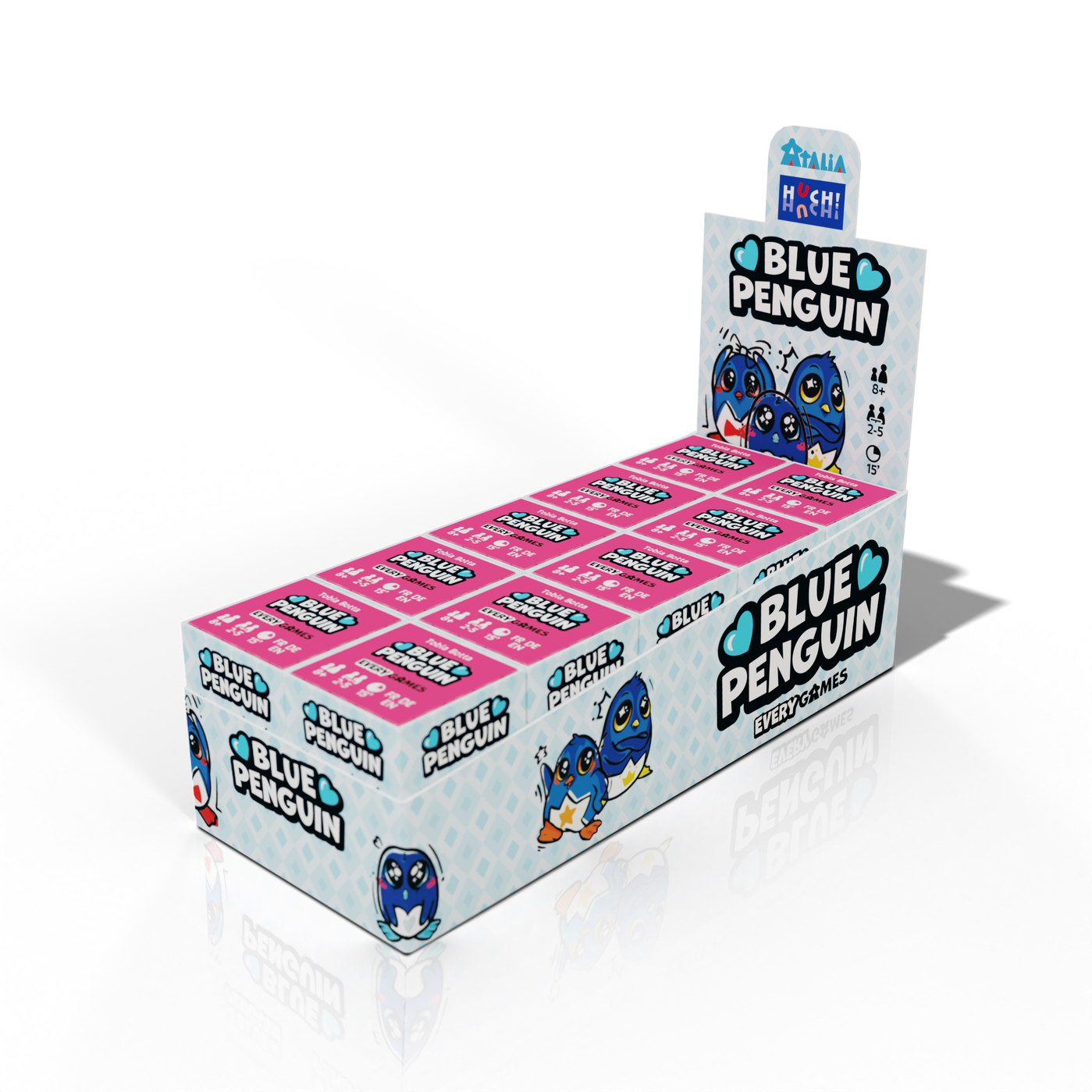 In Blue Penguin versucht ihr, die niedlichsten Pinguine anzulocken. Je kleiner sie sind, desto niedlicher! Das Problem ist aber, dass Pinguine immer den größeren folgen. Wer an der Reihe ist, spielt eine von seinen beiden Pinguin-Handkarten aus und zieht wieder nach. Hast du in der Runde die höchste Karte, darfst du die ausgespielten Pinguine einsammeln. Sind so alle 60 Pinguine verteilt, endet die coole Partie und ihr zählt eure Niedlichkeitspunkte. Diese werden entsprechend der zugeordneten Kartenfarben berechnet. Karten in den höheren Zahlenbereichen geben negative Punkte, während Karten in den niedrigen Bereichen positive Punkte bringen!