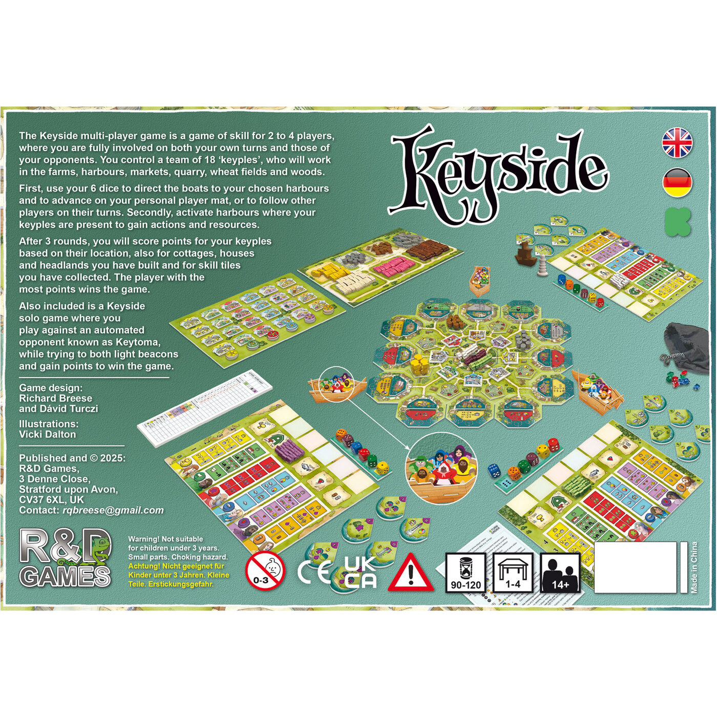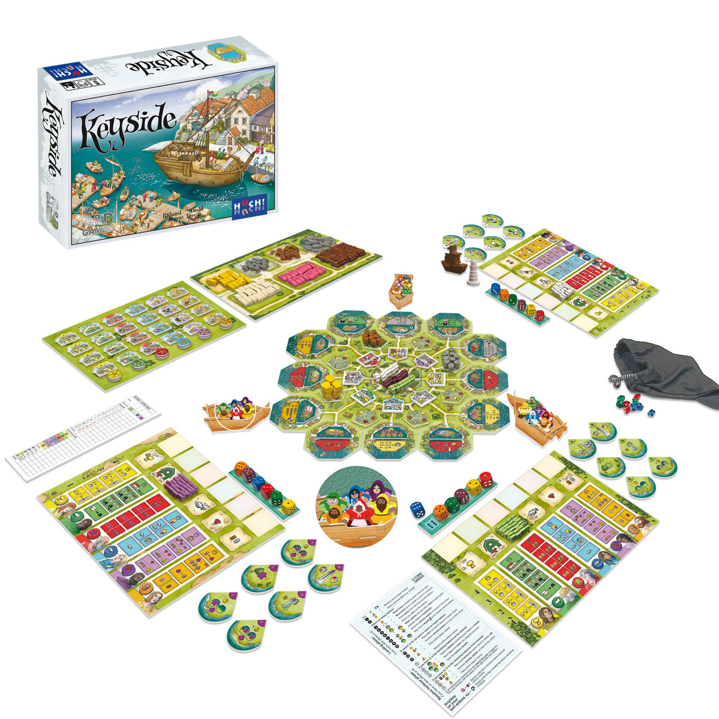 Eine Partie Keyside verläuft über 3 Runden, welche stets aus Landung und Hafenhandlung bestehen. Bei einer Landung platziert der aktive Spieler einen Würfel und bewegt das Boot in den Hafen, wobei andere Spieler ihm folgen können, so erhalten sie Präsenz in diesem Hafen. Bei der Hafenhandlung wird ein Hafen abgehandelt, auf dem ein Arbeiter des aktiven Spielers steht. Jeder dort vertretene Spieler erhält nun Vorteile, wie etwa Resourcen, Tiere, die Option zu Bauen usw. Spieler erhalten jedoch nur Punkte für Kriterien, die in Häfen mit ihren Arbeitern auch gefragt sind. Und je mehr Arbeiter, desto mehr Punkte. Und die meisten Punkte gewinnen! Keyside vereint Würfelmanipulation, Arbeiterinsatz, Aktionsfolge und Sets sammeln zu einem frischen, spannenden Kennerspiel.