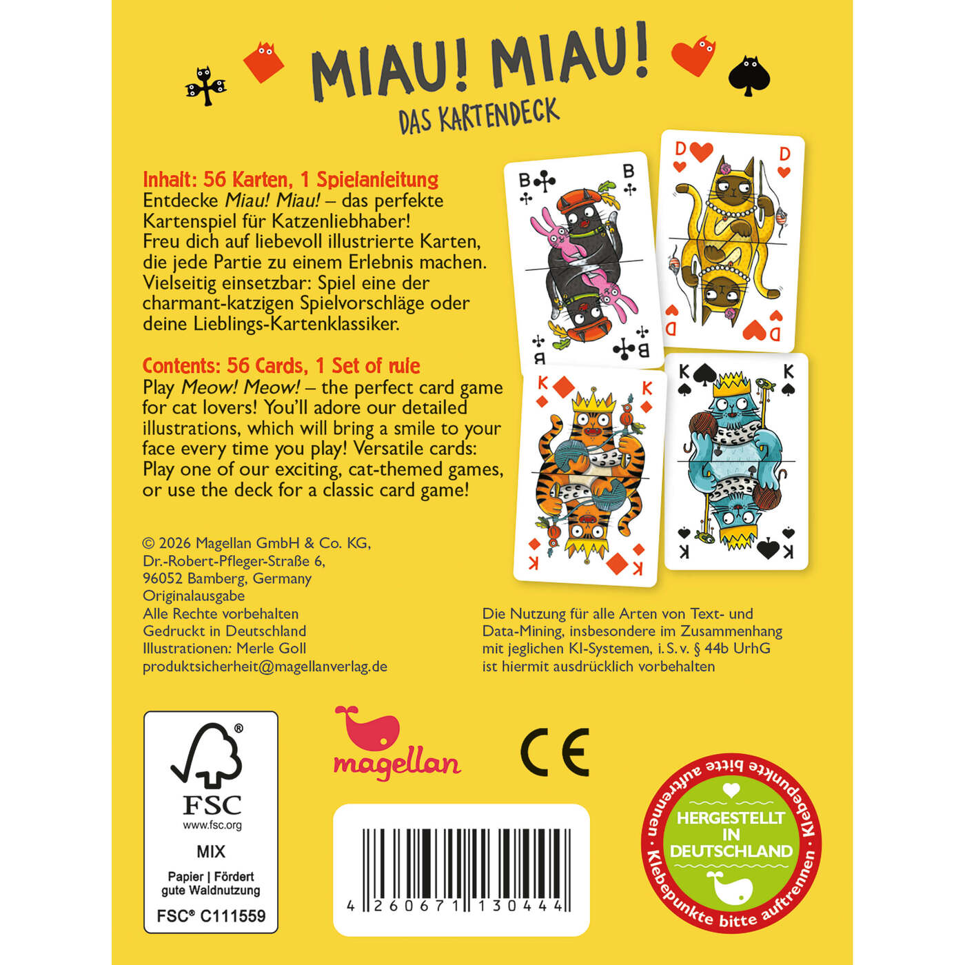 Der Kartenspiel-Klassiker im Katzen-Gewand! Mit „Miau! Miau!“ wird jeder Spieleabend zum unvergesslichen Erlebnis! Dieses Kartenspiel mit lustigen Illustrationen von Kater-Buben, Katzen-Damen und Kätzchen-Jokern ist ein Muss für alle Katzenliebhaber. In der handlichen Schachtel finden sich 56 einzigartige Karten in Pik, Kreuz, Herz und Karo sowie eine Anleitung (auf Deutsch und Englisch) mit drei spannenden Spielmöglichkeiten. Und das Beste: Mit diesem Standardblatt können auch viele altbekannte Klassiker gespielt werden!
