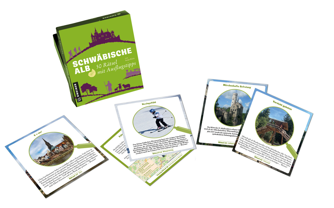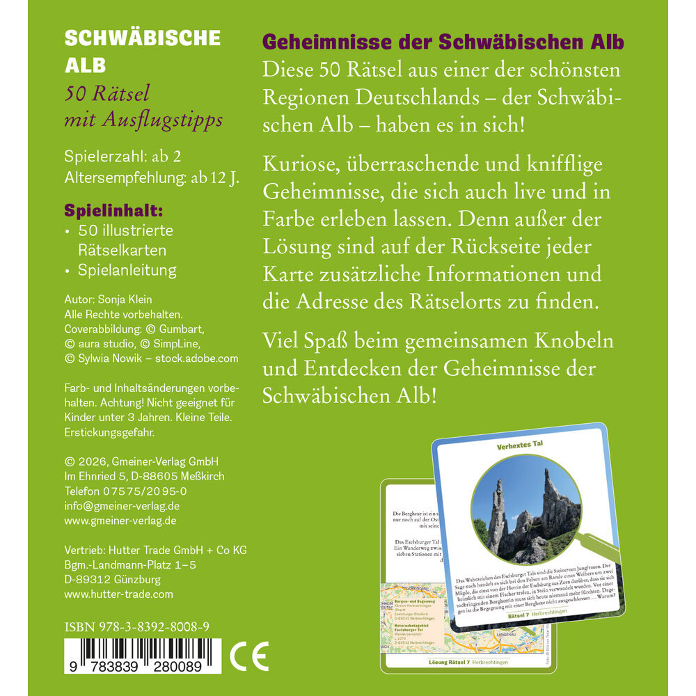 Diese 50 Rätsel aus einer der schönsten Regionen Deutschlands – der Schwäbischen Alb – haben es in sich! Kuriose, überraschende und knifflige Geheimnisse, die sich auch live und in Farbe erleben lassen. Denn außer der Lösung sind auf der Rückseite jeder Karte zusätzliche Informationen und die Adresse des Rätselorts zu finden. Viel Spaß beim gemeinsamen Knobeln und Entdecken der Geheimnisse der Schwäbischen Alb!