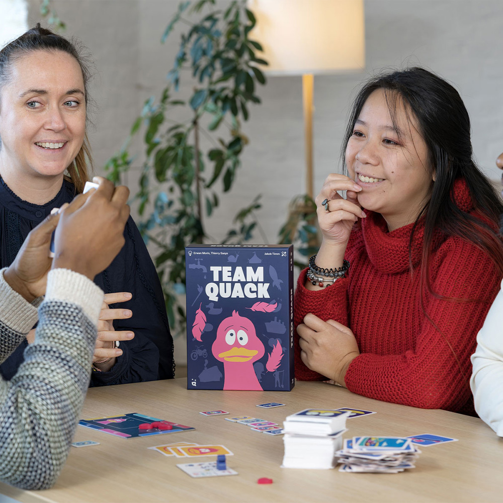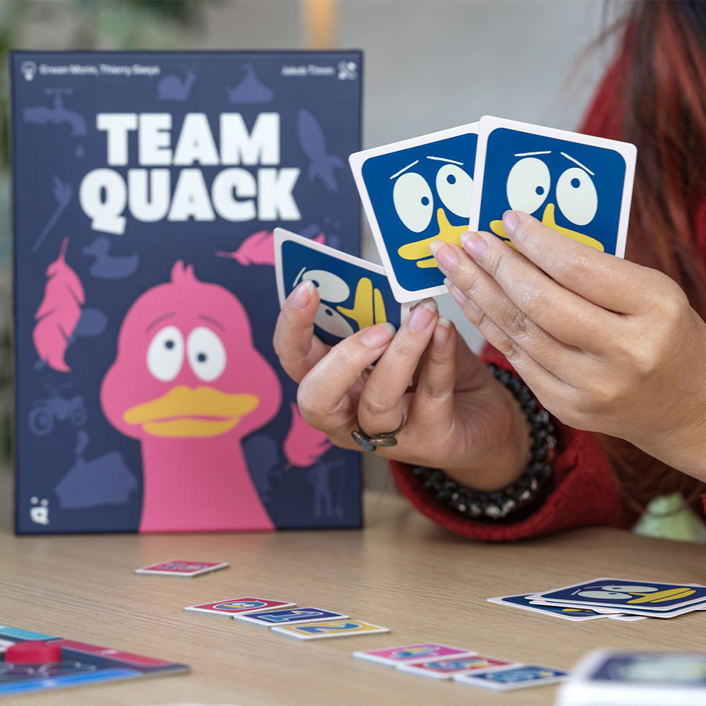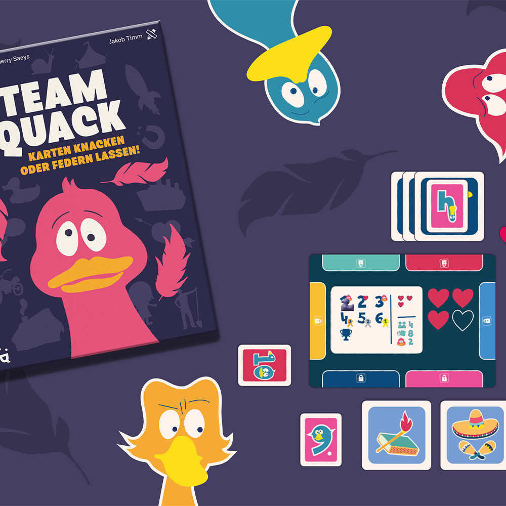 Team Quack ist ein kooperatives Spiel, bei dem scharfe Beobachtung und clevere Hinweise euch zum Erfolg führen! Arbeitet zusammen, entschlüsselt die Geheimkarten und gebt einander die richtigen Hinweise – ohne zu viel zu verraten. In jeder Runde müsst ihr einschätzen, wie offensichtlich eure Hinweise sind und wie leicht die anderen eure Geheimkarte erraten können. Aber Vorsicht: Zu viele falsche Rateversuche kosten euch wertvolle Leben! Zeigt, dass euer Team auf derselben Wellenlänge schwingt.