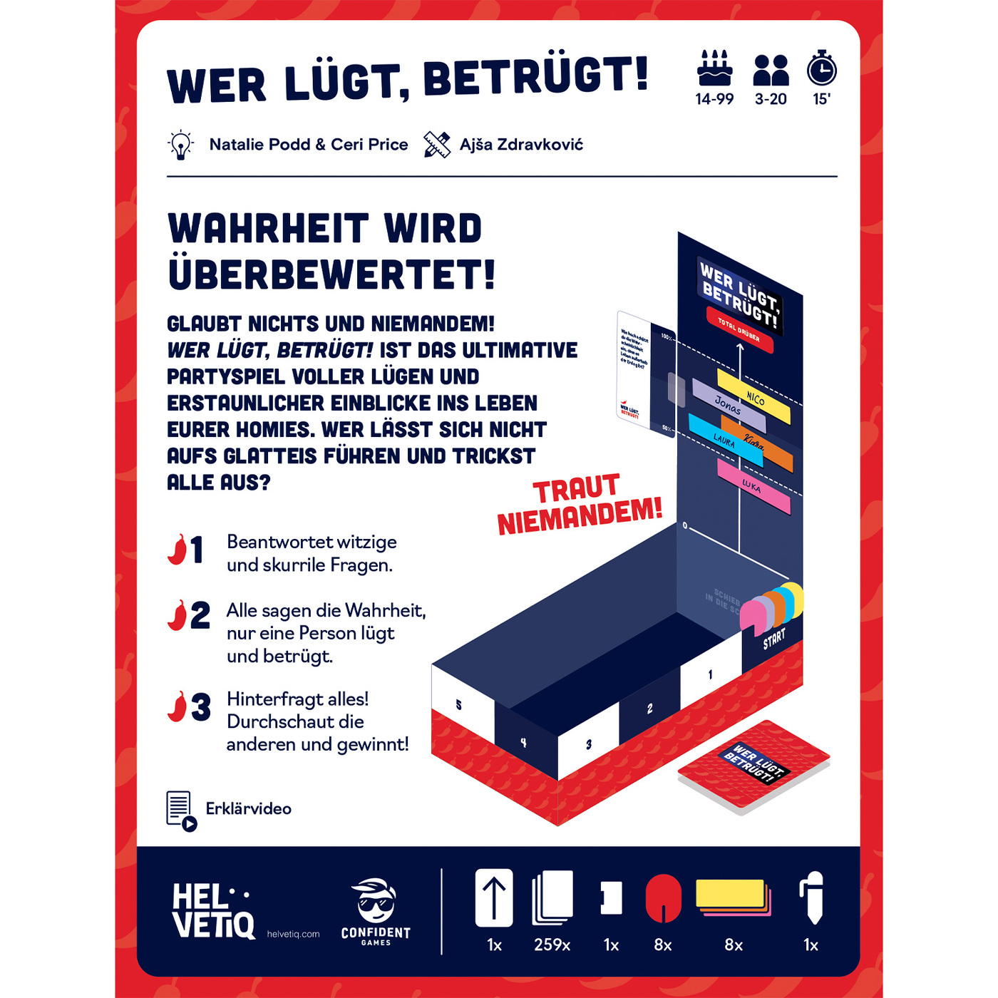 Ein grandioses Partyspiel zwischen Wahrheit und Lüge. Willkommen beim Kommunikationsspiel voller Lügen, Lachen und Enthüllungen. Seid ihr bereit, unerwartete Geheimnisse über eure Freunde zu erfahren? Doch Vorsicht, vielleicht erfahrt ihr mehr, als ihr eigentlich wissen wolltet. Glaubt besser nichts und niemandem! Nur wer am dreistesten lügt und sich nicht aufs Glatteis führen lässt, wird gewinnen!!